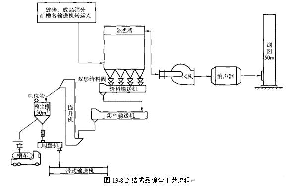 除尘工艺流程烧结成品工部除尘宜设计集中式除尘系统,选用分室反吹风或脉冲袋式除尘器,确保粉尘排放浓度小于50mg/m3(标准状态).收下粉尘经链板输送机和斗式提升机集中到粉尘槽内.