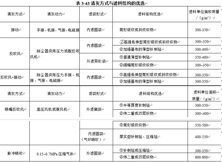 不同清灰方式的袋式除尘器,因清灰能量,滤袋形变特性的不同,宜选用不同结构品种的滤料.机械振动类袋式除尘器是利用机械装置(包括手动,电磁振动,气动)使滤袋产生振动而清灰的袋式除尘器. 分室反吹类袋式除尘器是采用分室结构,利...