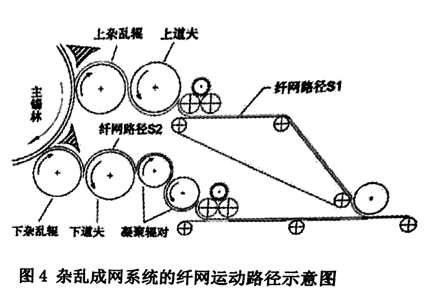 杂乱成网系统包括上,下两道成网机构,它们在设计上有差异,而这样设计有两个优点:(1)与下道成网机构相比,上道成网机构少一对凝聚辊,这有利于提高生产速度,符合非织造布高速生产的要求.(2)两者的路径不同,分别形成一层纤网,...