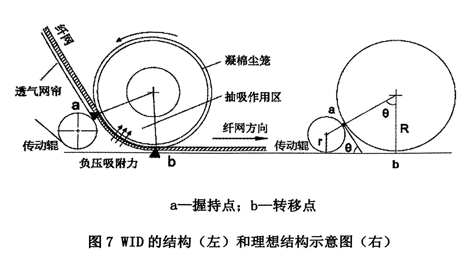 WID主要由凝棉尘笼和抽吸辊构成,其功能依靠抽吸作用区的抽吸作用实现.纤网经过透气网帘被输送至抽吸作用区时因受到吸附而被握持,形成握持点a,再通过凝棉尘笼的转动作用,纤网经过转移点b被平缓转移到输网帘上.