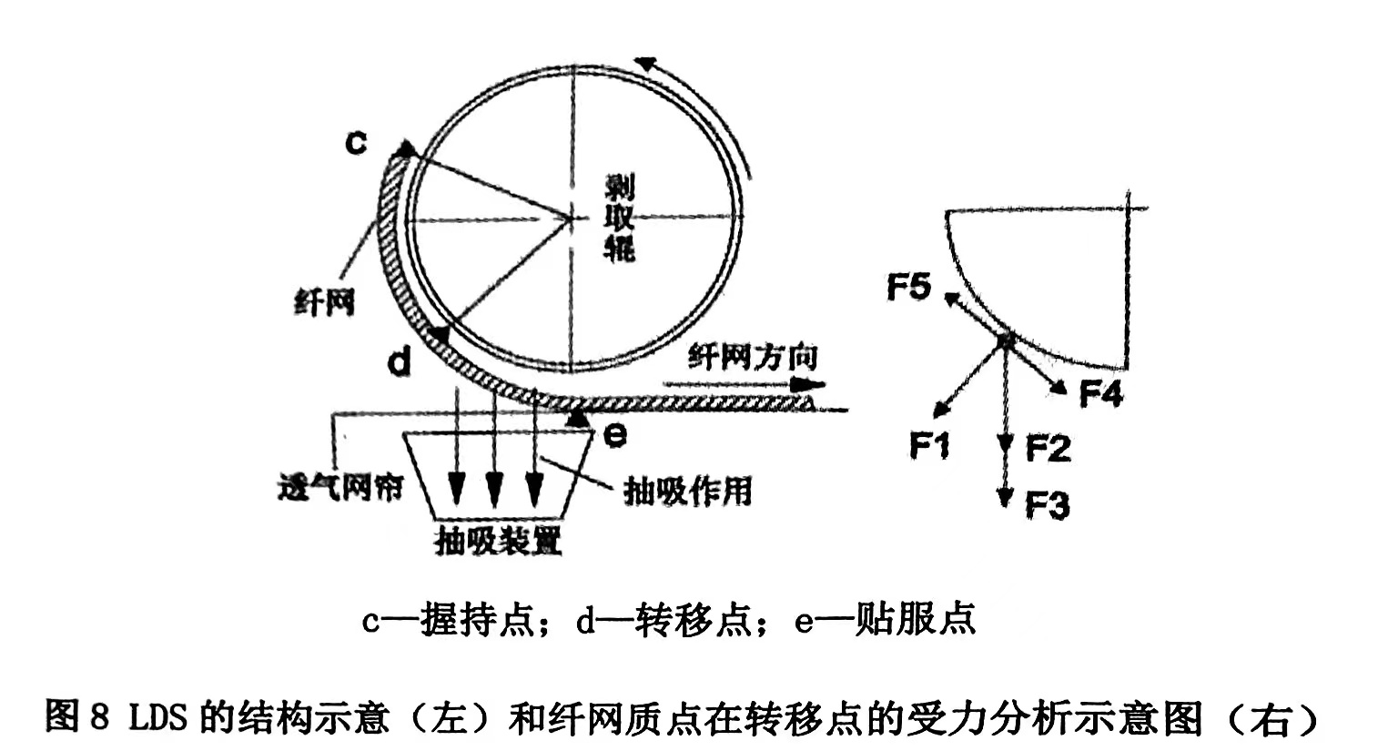 纤网质点受到垂直向下的合力作用,其速度增大,动能也相应增大,所以能够快速地到达透气网帘,并在持续的抽吸作用下紧贴透气网帘表面,实现高速,平稳的转移效果.
