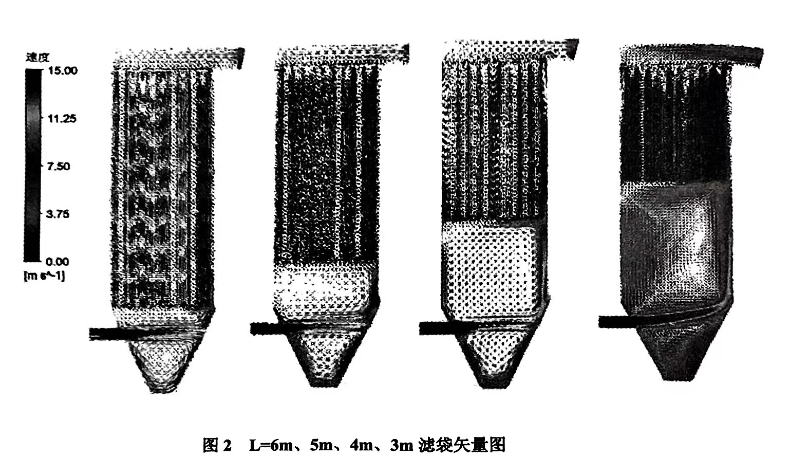 在袋式除尘器中远离进风口处滤袋承担风量较大。随滤袋长度缩短,除尘器内部空间增大,在滤袋下部与灰斗之间容易发生涡旋,造成内部速度分布及滤袋风量分配不均匀,出口对侧流速过高。滤袋为6m长时,除尘器内各滤袋流量的分配和内部流场...