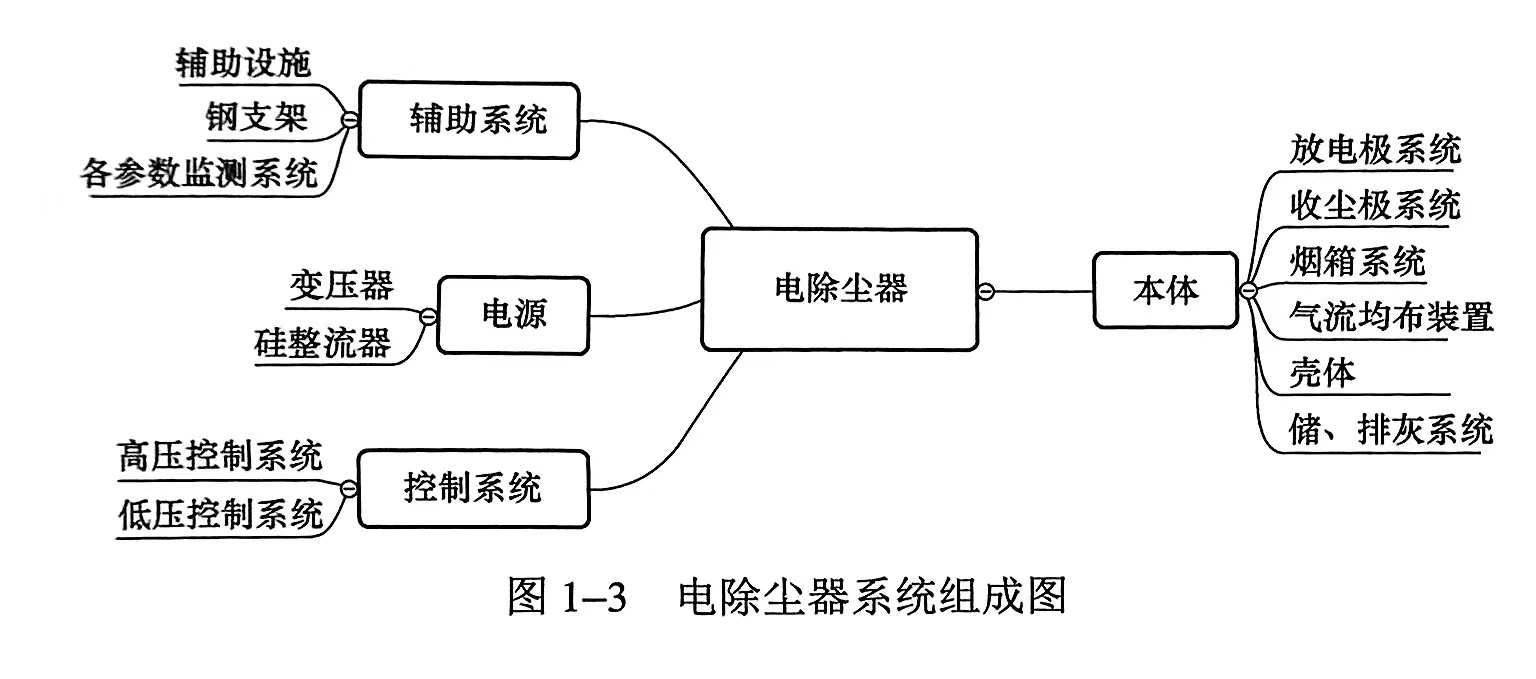 电除尘器主要可以分为电除尘器本体,电源,控制系统,辅助系统四个系统.
