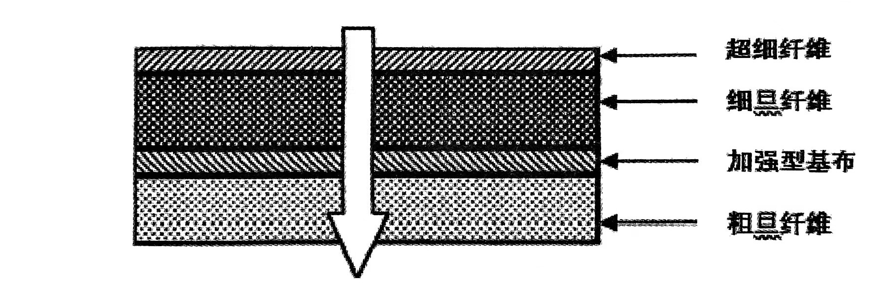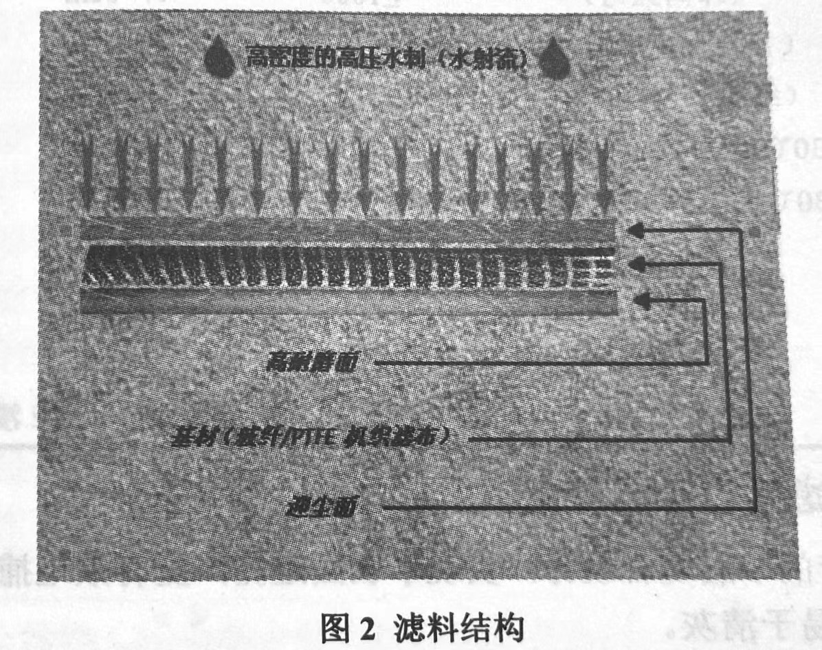 滤料迎尘面选用性能优异的细旦改性腈纶及PTFE纤维,以柔性高压水流取代刺针在纤网中由上至下连续喷射并通过托网帘的反射作用使纤维相互缠绕成布.