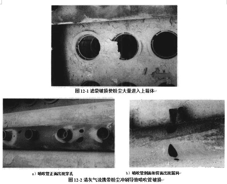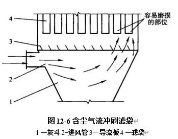 下述原因易导致含尘气流对滤袋的冲刷, 除尘器釆用灰斗进风,而且没有采取气流分布装置,或气流分布装置效果欠佳.设在灰斗上沿的气流分布装置不合理,未起到均布作用,导致滤袋受冲刷而破损.