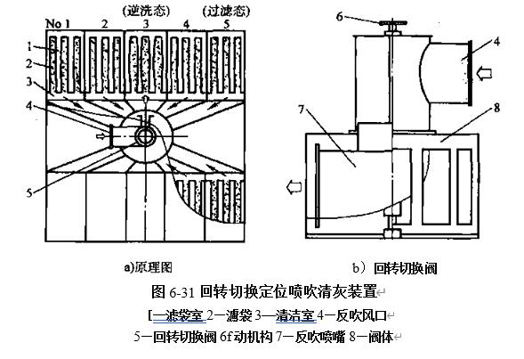 回转切换阀是针对分室结构类袋式除尘器切阀门多,故障率高,运行不可靠而开发的一项专利技术,用一阀代替多阀,实现分室切换定位反吹清灰. 三状态阀是为实现三状态清灰而专门开发的筒形阀体,与回转切换阀配合使用.