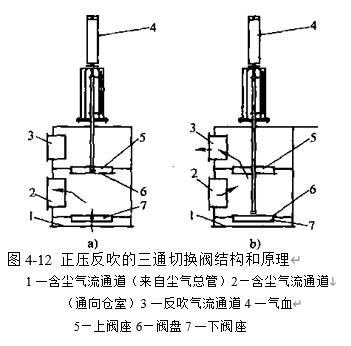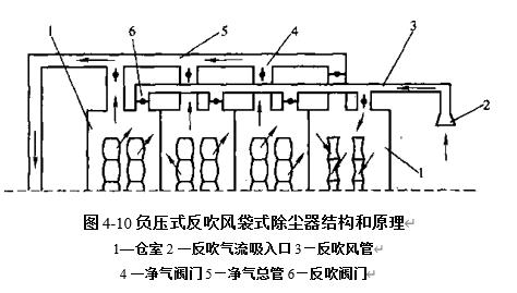 分室反吹清灰装置有负压式和正压式之分.负压式分室反吹清灰装置的结构和原理.其清灰过程是逐室进行的.在除尘器的每个仓室出口处设有净气阀门和反吹阀门.