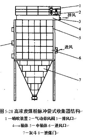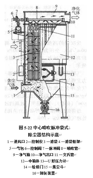 中心喷吹脉冲袋式除尘器的结,含尘气体由箱体下部进入,粉尘阻留在滤袋外表面,干净气体穿过滤袋壁进入袋内,然后由上箱体排出.清灰时,脉冲阀受控制器的指令而开启,稳压气包中的压缩空气经喷吹管上的喷孔喷出,并借助位于袋口的文氏管...