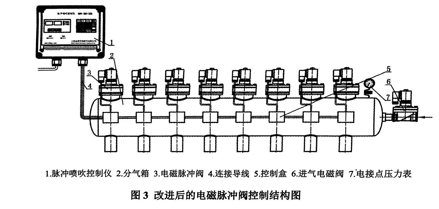 本文中推出的改进方案为:在分气箱(气包)外侧设置与电磁脉冲阀数量相等控制盒.分气箱外设有脉冲喷吹控制仪和进气电磁阀.