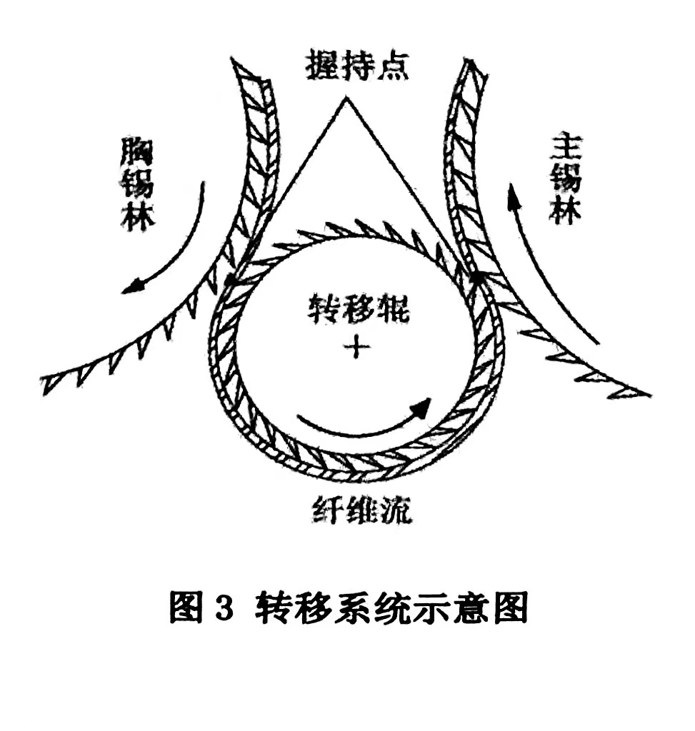 该非织造梳理机的转移系统是通过一个高速运转的圆形转移辊来实现高速转移的.