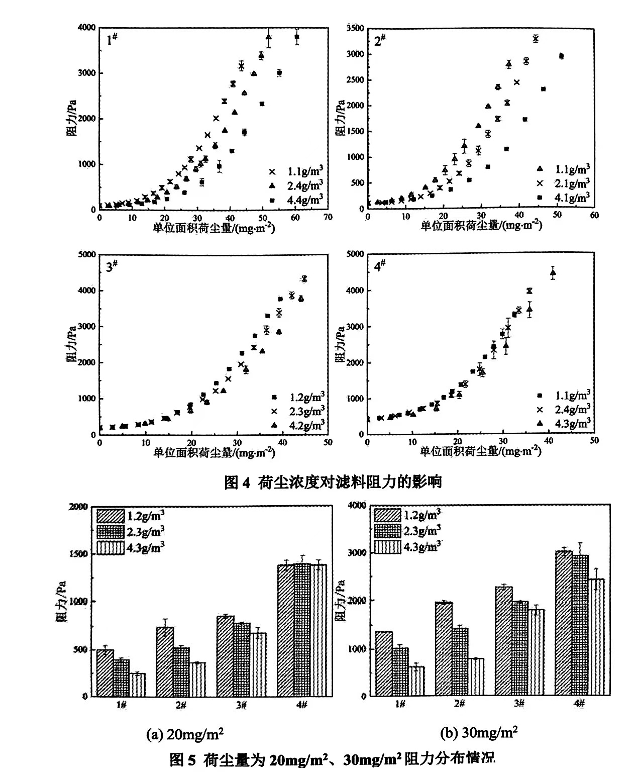 在荷尘初期,等级较高的滤料内部空间较小,荷尘时粉尘颗粒排列的自主性较低,不同质量浓度时排列紧密程度大致相同,因而在深度过滤阶段荷尘浓度对于滤料阻力的影响不明显.到表面过滤阶段,粉尘颗粒分布的影响突出,荷尘浓度对等级较高滤...