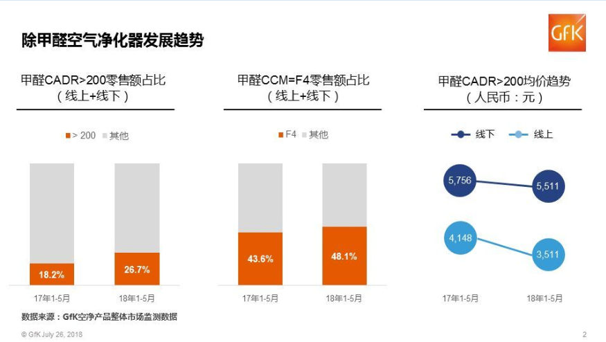 GfK数据显示,2018年1-5月,家用空气净化器甲醛CADR(洁净空气输出比率)在200以上的零售额占比同比增长接近9个百分点,甲醛CCM(累计净化量)为F4级别的零售额占比同比增长接近5个百分点。