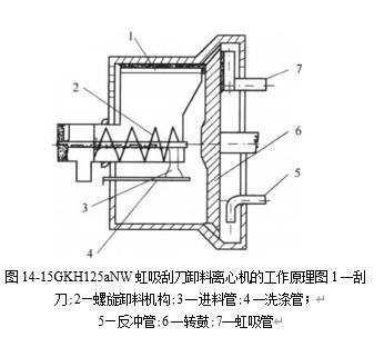 图14-15所示为GKH1250-NW卧式虹吸刮刀卸料离心机的工作原理。