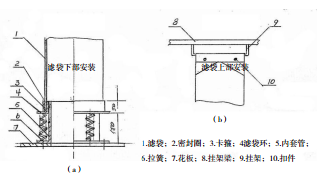 1)取消滤袋上端口吊帽、弹簧及拉链,改用图1中(b)所示扣件10,将滤袋上端固定在挂架梁8下的挂架9上。 (2)在花板上平面安装图1(a)所示的向下拉紧装置,该装备由密封圈2、卡箍3、滤袋环4、内套管5、弹簧6组成。内套...